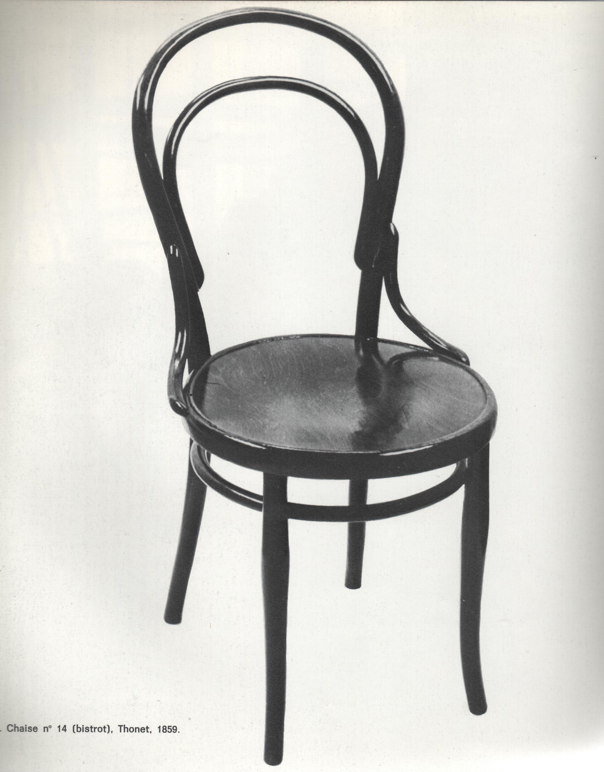 La chaise n° 14 de la firme Thonet, créée par Michael Thonet en 1853, est un jalon précoce de la modernité. Elle date de 1859, mais Thonet avait déjà exposé des modèles sous le Crystal Palace à l’exposition universelle de Londres en 1851* et à l’exposition universelle de Paris en 1855 (où elle remporta un franc succès qui permit à la firme d’accroître considérablement ses commandes à l’exportation). D’abord artisanale, la production de Thonet s’industrialise à partir de 1857. La n°14 est la plus connue et la plus vendue des chaises Thonet mais fait partie d’un catalogue complet comprenant des chaises, des fauteuils, et des bancs offrant diverses variations dans la forme des accotoirs et des dossiers.